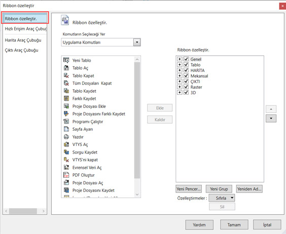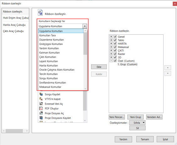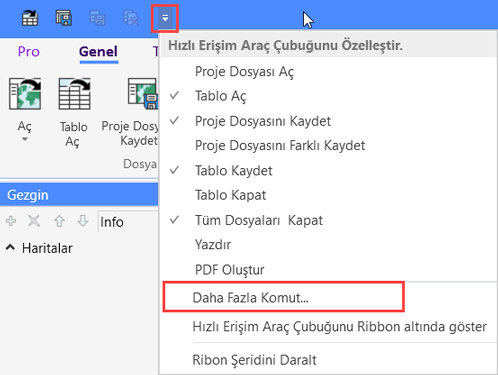 MapInfo Pro’nun sol üst köşesinde işaretli olan açılır listeden Daha Fazla Komut… seçeneğini seçiniz.