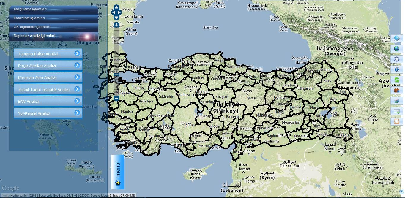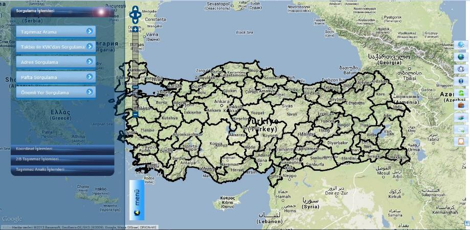 - ⊕ Uygulama Milli Emlak Genel Müdürlüğü için İstanbul ilinin Fatih, Beykoz ve Çatalca ilçeleri pilot bölge kabul edilerek başlanmış ve Türkiye geneline uyarlanabilir bir sistem geliştirilmiştir. Uygulamada tüm Türkiye’de yaklaşık 3,000,000 Hazine parsel geometrisi üzerinde sorgulama ve analiz işlemleri yapılabilmektedir.